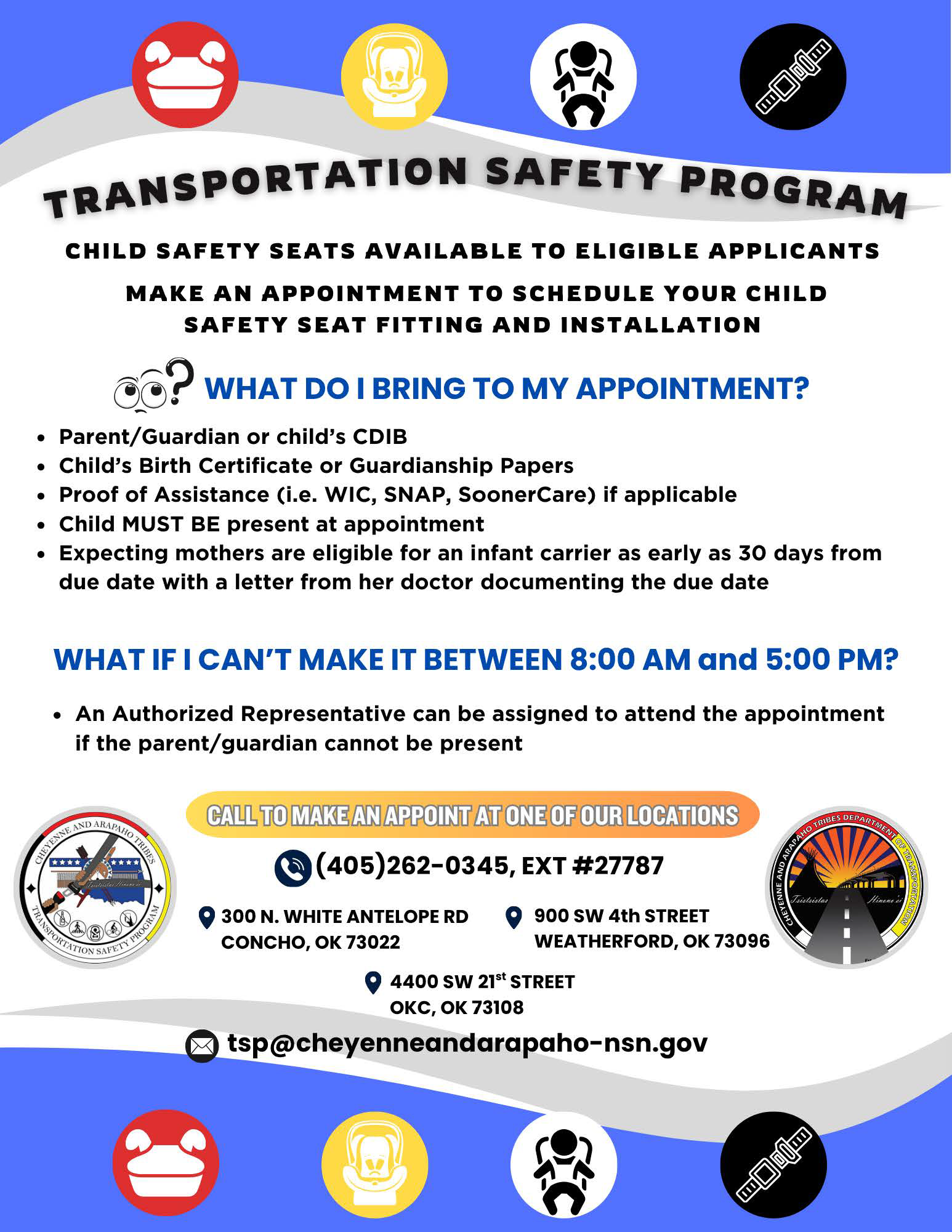 The Tribal Transportation Safety Program (TTSP) provides innovative, hands-on community-based activities to combat distracted driving and impaired driving, educate on bicycle and pedestrian safety, and improve seat belt and child restraint system used in the tribal service area. The TTSP office is located on the Concho Reserve in Concho, OK, and consists of the Safety Coordinator and the Administrative Assistant. TTSP services include Defensive Driving Courses, Alive at 25 Courses, Car Seat Safety Events, Informational Booths/Safety promotion at Pow Wows, other cultural events, schools, colleges, and tribal offices. The Tribal Transportation Safety Program has two certified distracted driving instructors. Certified child passenger safety technicians are also available to properly install car seats and the Roads Building is a permanent fitting station.